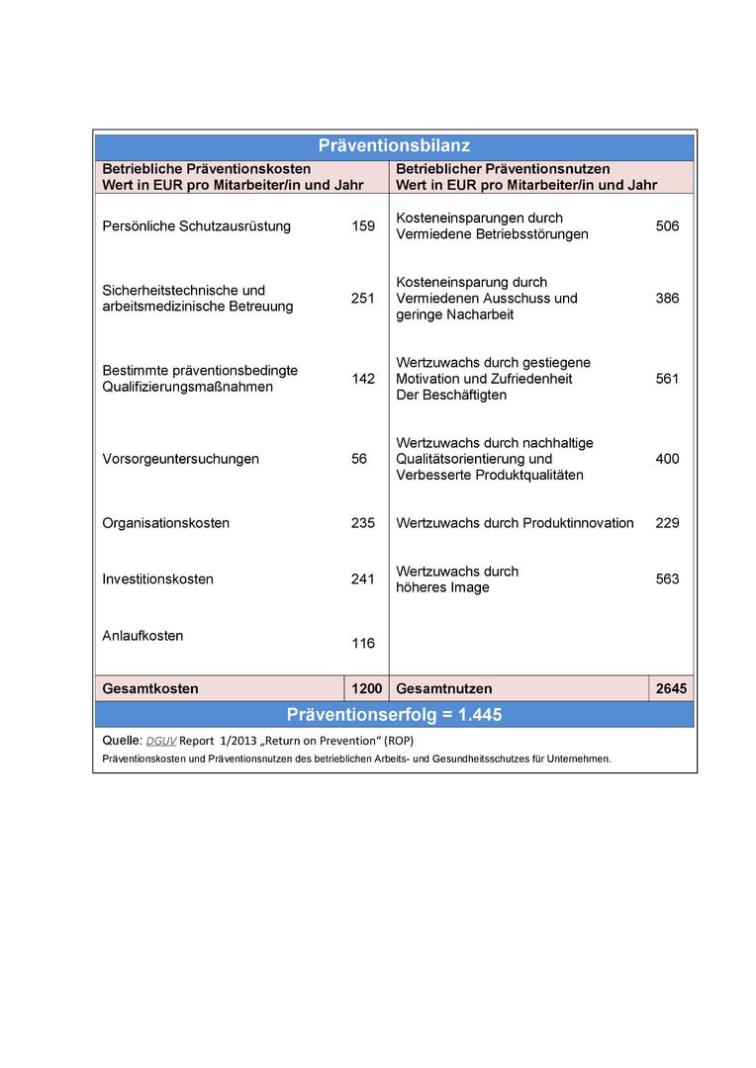 Unter Berücksichtigung aller Faktoren wurde der "Return on Prevention" (ROP) mit einem Mittelwert von 2,2 angegeben. Das bedeutet eine Erhöhung der investierten Summe um mehr als das Doppelte...